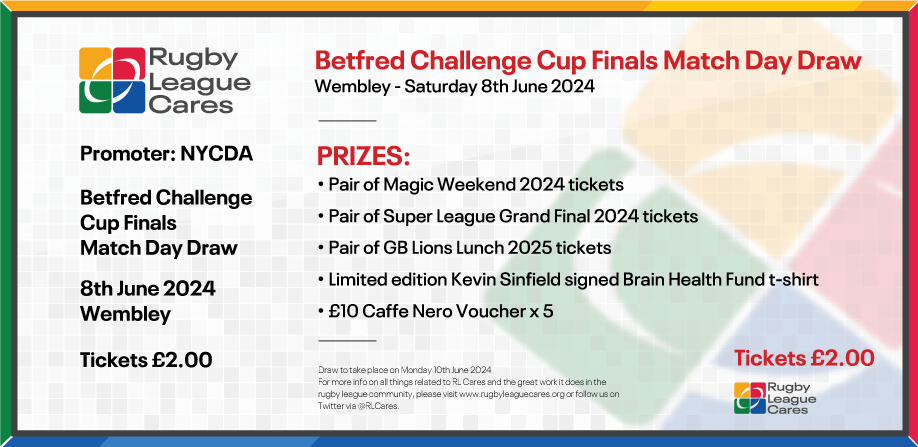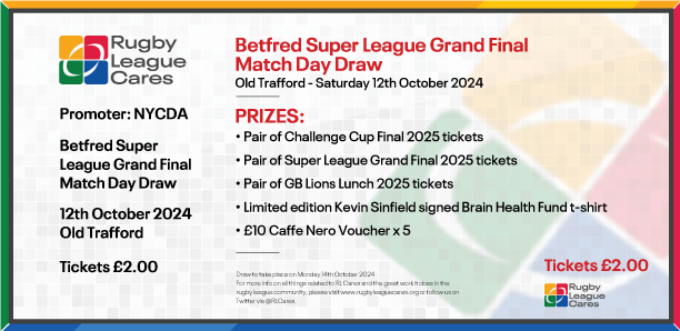 WELCOME TO RUGBY LEAGUE CARES MATCH DAY DRAW BETFRED CHALLENGE CUP FINAL MATCH DAY DRAW £0.00 WembleySaturday 8th June 2024Buy Now BETFRED CHALLENGE CUP FINAL MATCH DAY DRAW £0.00 WembleySaturday 8th June 2024Buy Now MAGIC WEEKEND MATCH DAY DRAW £0.00 Elland Road, LeedsSaturday 17th and Sunday 18th August 2024Buy Now BETFRED SUPER LEAGUE GRAND FINAL MATCH DAY DRAW £0.00 Old TraffordSaturday 12th October 2024Buy Now